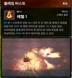 消耗SP7,在前方9M内的敌人脚下产生70%伤害的火焰爆炸。该技能产生暴击时,会发动爆炸的火焰旋风,追加50%灼伤伤害。